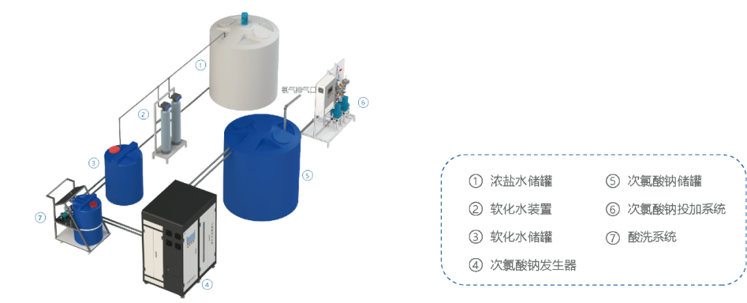 電解次氯酸鈉發生器由次氯酸鈉發生器本體、軟化水系統(含再生裝置)、溶鹽系統、稀鹽水配制系統、次氯酸鈉電解發生系統、冷卻系統、次氯酸鈉儲存及投加系統、即時排氫系統、自動控制系統九部分組成,可根據用戶要求適當增減設備配置。
